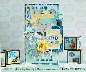 В работе использовала цветочки из наборов 57 Happiness-2 и 60 Крокусы. В поддержание морской темы добавила ракушку, голубую сизаль и высечки. Для многослойности использовала отштамповыные цветочки, листики, вырубку и чипборд. Так же добавила немного дропсов, они мне напоминают брызги от накатывающих на берег волн ... "